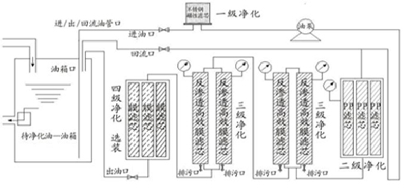 采用高分子材料制成的深层复合式滤材,配合其它不同材质、特性、精度的滤材制成的多级无压反渗透纯物理净化设备。整机设计回流管,自动压力控制器排放,故工作时为无压或微压状态,让油品从外面渗透到各级滤材。滤材具有亲油疏水、疏渣特性,在微压/无压状态下水分和杂质都会留在滤材的表面,在油液流动的状态下,由于重力的作用沉于管路底部,排出即可。一次净化就能让油品清澈透明,清洁度达到新油标准,含水量100PPM以下。