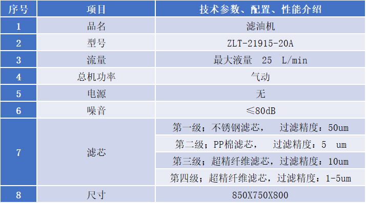 1、逐层过滤,分别过滤掉油品中的游离水、乳化水、高温引起的氧化碳渣、大颗粒杂质、小颗粒及超小颗粒油泥等杂质,只需一次过滤就恢复清洁:颗粒度达到NAS7~9级。
