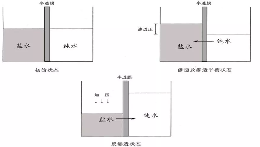 但如果在含盐量高的水侧,试加一个压力,其结果也可以使上述渗透停止,这时的压力称为渗透压力。如果压力再加大,可以使方向相反方向渗透,而盐分剩下。因此,反渗透除盐原理,就是在有盐分的水中(如原水),施以比自然渗透压力更大的压力,使渗透向相反方向进行,把原水中的水分子压力到膜的另一边,变成洁净的水,从而达到除去水中杂质、盐分的目的。