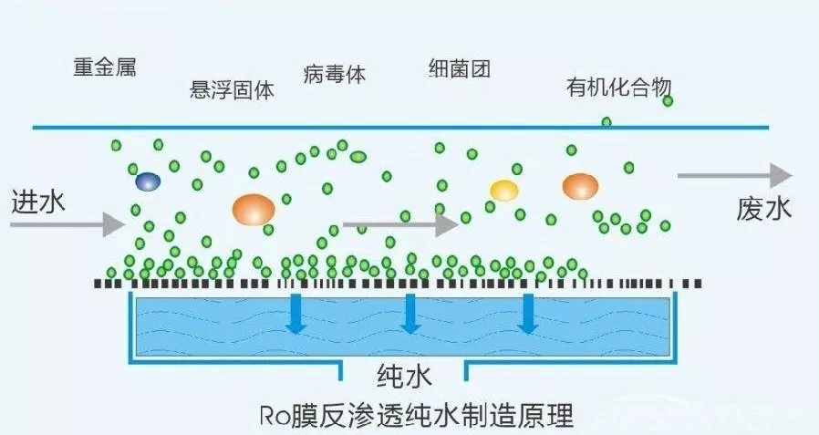 RO是英文 Reverse Osmosis membrane 的缩写,中文意思是(逆渗透),由于RO 膜的孔径是头发丝的一百万分之五( 0.0001 微米) , 一般肉眼无法看到,细菌、病毒是它的 5000 倍,因此,只有水分子及部分有益人体的矿物离子能够通过,其它杂质及重金属均由废水管排出,所有海水淡化的过程,以及太空人废水回收处理均采用此方法。