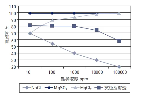 真正分离概念上的纳滤是满足道南效应,并对离子具有选择截留性的过滤膜,一种氯化钠透过率与氯化钠浓度成正比、且该比例大于 0.4 的膜。其主要用于各种料液的脱盐和浓缩。0% NaCl 截留率在 30,000 ppm 浓度的 NaCl 和其他种类的离子相混合条件下,纳滤膜测试得到的。在纯30,000 ppm 浓度的 NaCl 溶液条件下。纳滤膜对 NaCl 的截留率为 5% -15%。当 NaCl 的浓度低于30,000ppm甚至更低的,纳滤膜 NaCl 的截留率在 15%以上。纳滤膜对 NaCl 等盐类实际截留率主要取决于进水的组成成份和膜属性(见图)